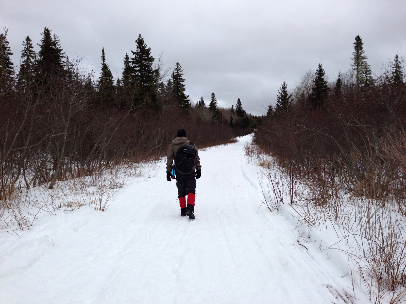 Time for Plan B to kick in. There was a quiet road through the area used by skiers, skidoos and ATVs that was more or less packed down. Not quite as scenic but we still get to enjoy the great outdoors and pack in a decent hike.