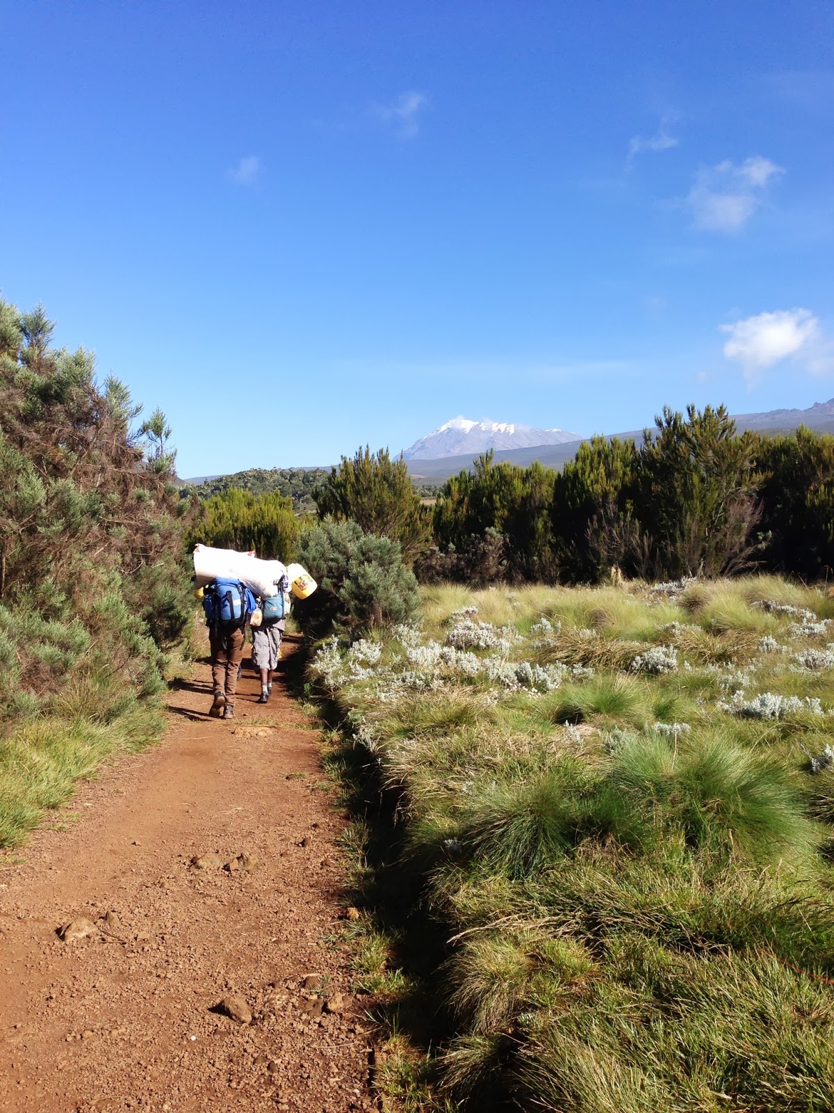 Each day usually starts with a wake up call at 6am, breakfast at 6:15 and ready to go by 7:30. Only a few minutes pass before the shady trees of the rainforest are replaced by lower growing vegetation of the habitat they call moorland. Sunblock is necessary today. We catch a good view of the mountain which still seems to be so far away. You have to appreciate the incredible job performed by the porters who sometimes carry one backpack on their back and another on the head/shoulders. They are modern day superheroes !