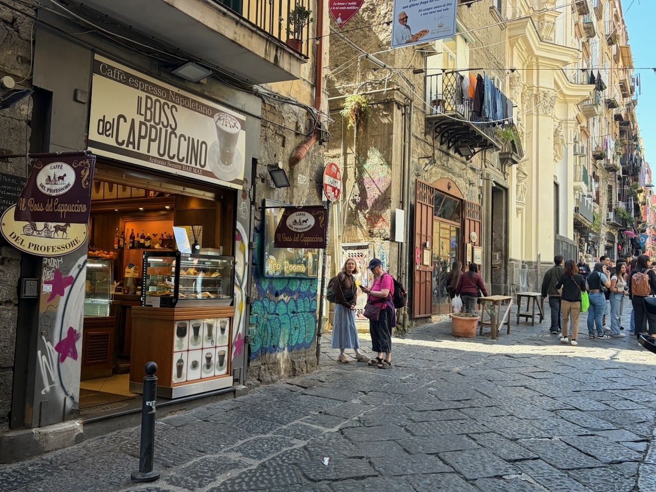 Off to the train station for a visit to Naples (or Napoli) which takes about 1hr10min. Naples historic district consists of a maze of narrow, walkable streets with few cars but tons of motorized scooters racing about. The alleys are filled with shops, cafes and restaurants galore with piazzas and churches breaking the maze up into sections. As I had a quick coffee before leaving, I treated myself to a cappuccino at this shop as it was still before noon. Why does that matter ? Well, Italians consider it a faux pas to order a coffee with milk in the afternoon, as milk drinks are harder to digest after a meal. Huh! It was yummy!